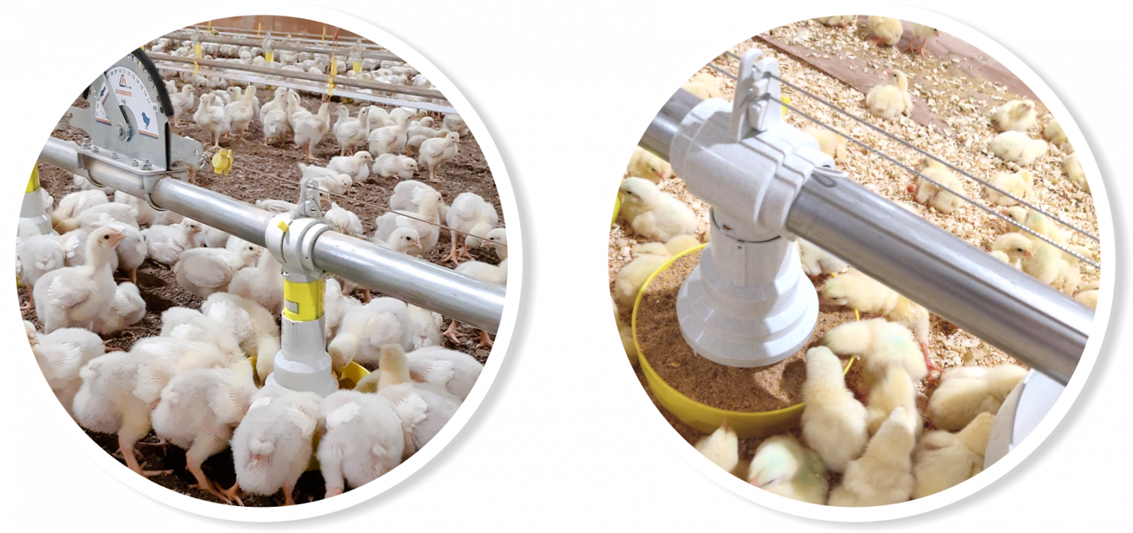 • Regulagem manual coletiva do nível de ração no prato a cada 55m;